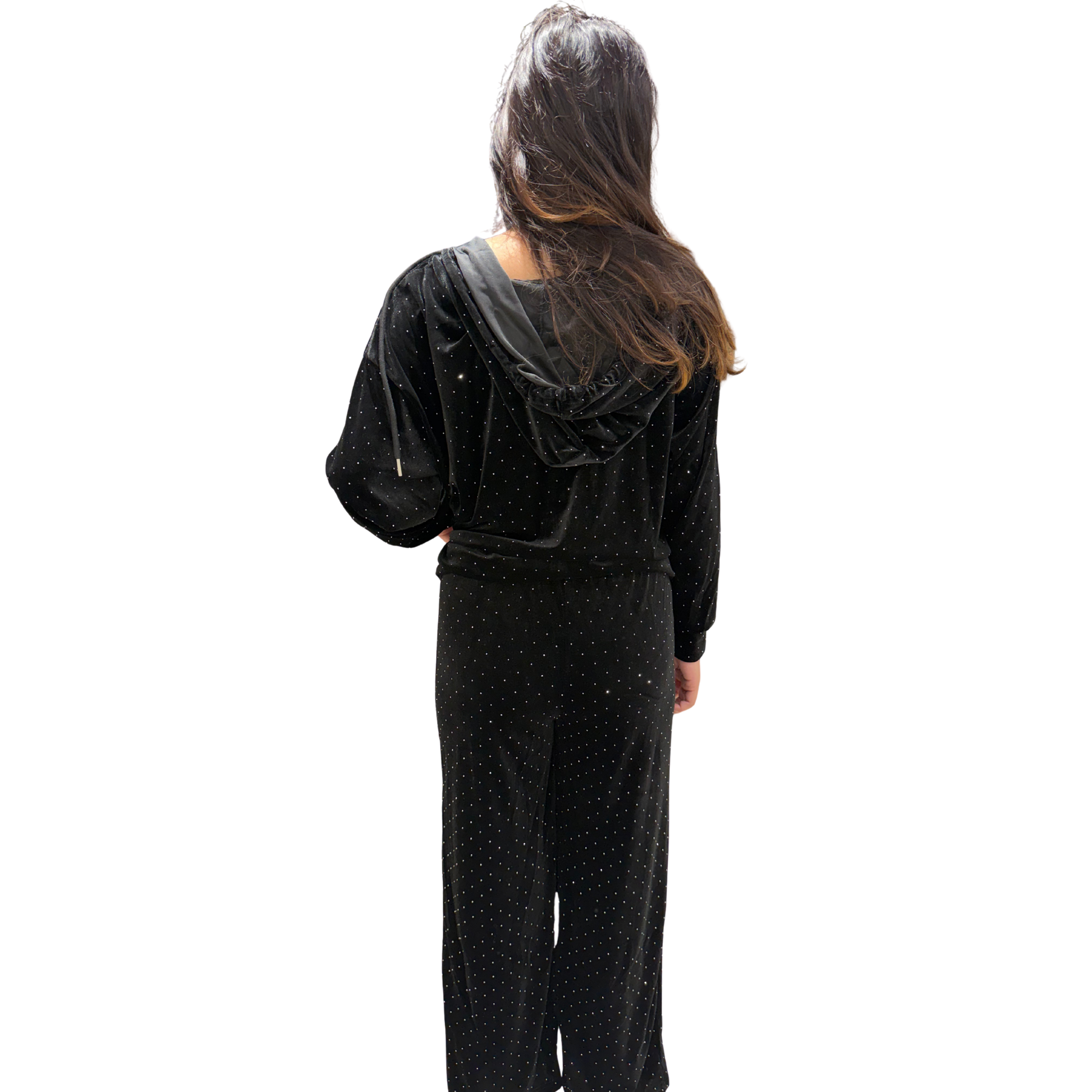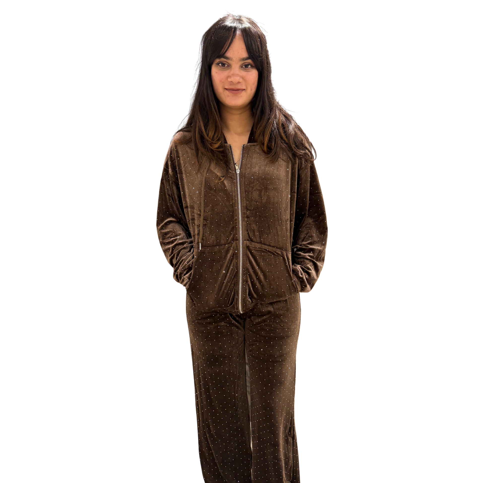 Elevate your loungewear collection with this luxurious velour set in a rich cocoa tone. Crafted from soft, plush velour fabric, this coordinated ensemble combines comfort with understated elegance. The subtle sparkle detailing adds a touch of sophistication, making it perfect for both relaxed at-home moments and casual outings. The set's premium construction ensures durability and maintains its sumptuous feel through multiple wears. Ideal for those who appreciate quality basics that seamlessly transition from day to evening wear.