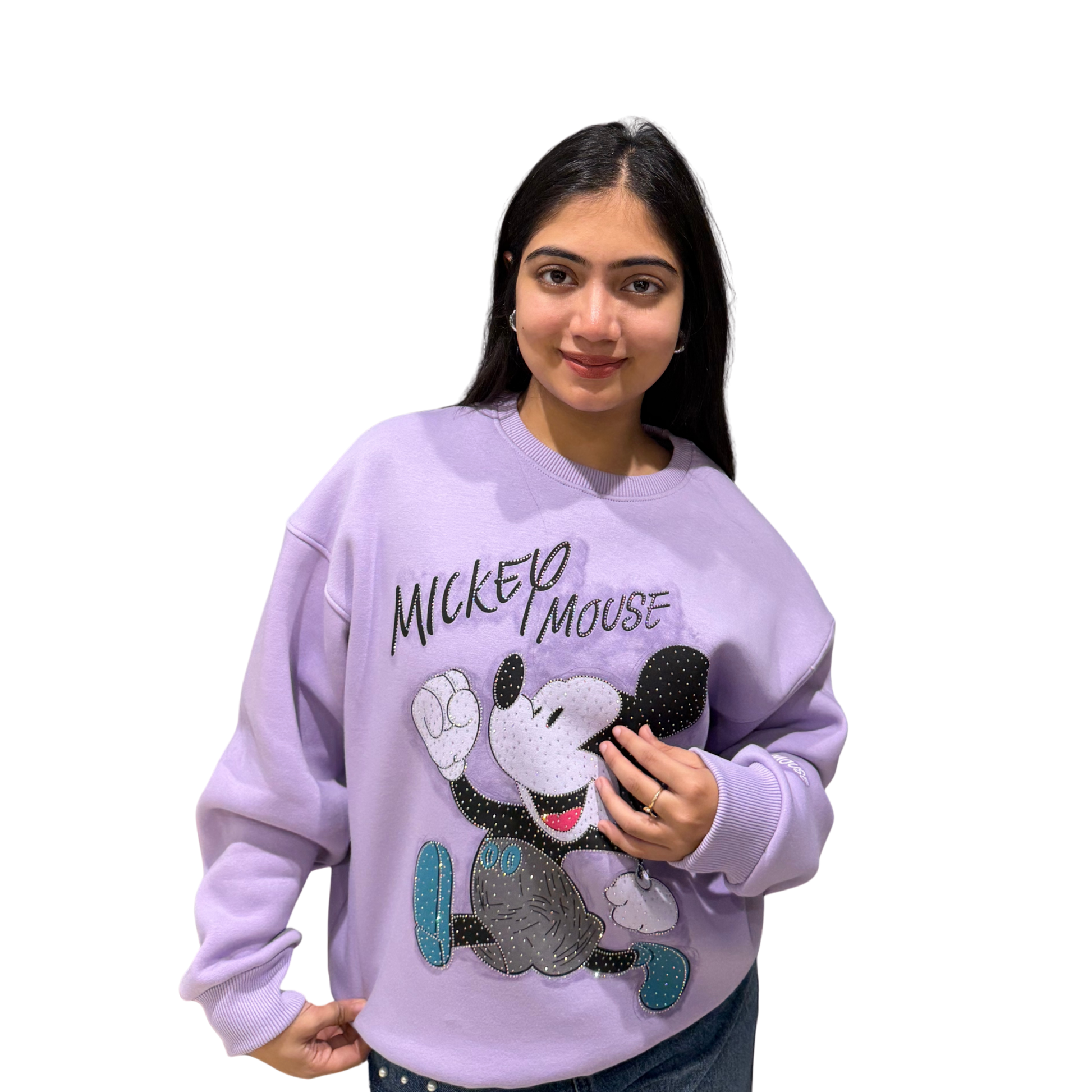 Add a playful touch to your everyday wardrobe with the Lavender Mickey Mouse Graphic Sweatshirt. Designed for comfort and style, this oversized sweatshirt features an iconic Mickey Mouse graphic print with subtle embellished detailing that adds charm without being overpowering.